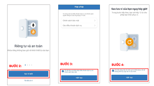 Bước 3: Tích vào ô đồng ý với các điều khoản bảo mật (Ví dụ: “Nếu tôi làm mất cụm từ khôi phục, tôi sẽ mất tài sản”). Đây là Hợp đồng miễn trừ trách nhiệm. Khi tích vào đây, bạn xác nhận rằng bạn hiểu Trust Wallet không lưu giữ thông tin của bạn. Nếu bạn mất tiền do mất khóa, Trust Wallet không thể can thiệp hay bồi thường. Bạn đang ký vào bản cam kết “Tự chịu trách nhiệm”.