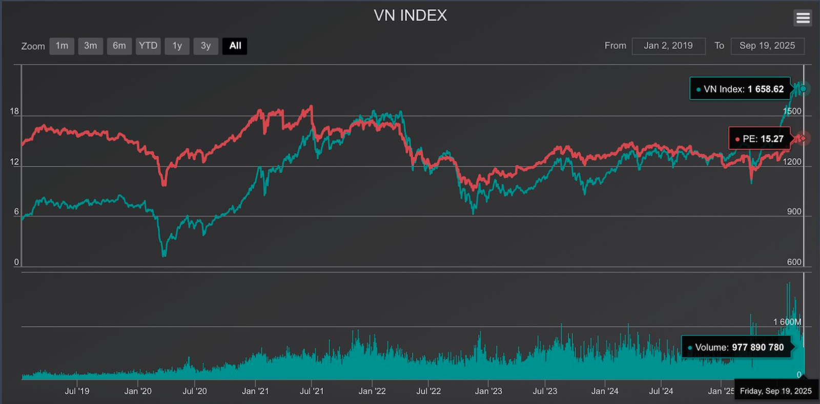 Tính tới thời điểm hiện tại, P/E của VN-Index rơi vào khoảng 15,0x lần, cao hơn trung bình 5 năm nhưng vẫn thấp hơn nhiều so với giai đoạn tạo đỉnh trước (22 lần năm 2018 và trên 20 lần năm 2021–2022). Điều này cho thấy, mặc dù không còn rẻ, thị trường vẫn chưa phải là giai đoạn quá nóng so với quá khứ, mà vẫn còn dư địa tăng trưởng. Đây là thời điểm đòi hỏi sự chọn lọc từ các nhà đầu tư.