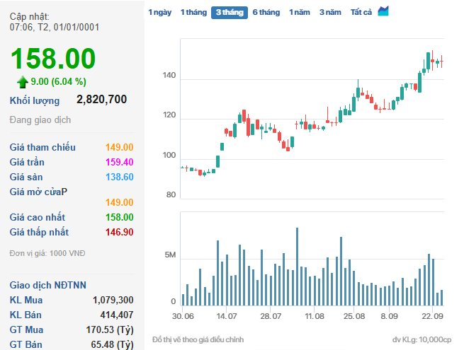 Cụ thể, kết phiên 25/9, giá cổ phiếu VIC ở mức 158.000 đồng/cổ phiếu, tăng bứt phá 6,04% so với phiên trước, khối lượng cổ phiếu giao dịch khớp lệnh đạt gần 2,4 triệu đơn vị.