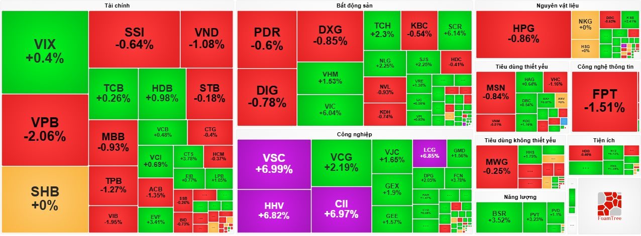 Bên cạnh đó, loạt mã cổ phiếu vốn hóa lớn tại các nhóm ngành khác điều chỉnh mạnh, gây áp lực lên chỉ số chính, như: VND -1,08%, FPT -1,51%, VHC -1,16%, PNJ -1,6%, DGW -1,28%, BWE -1,99%, …