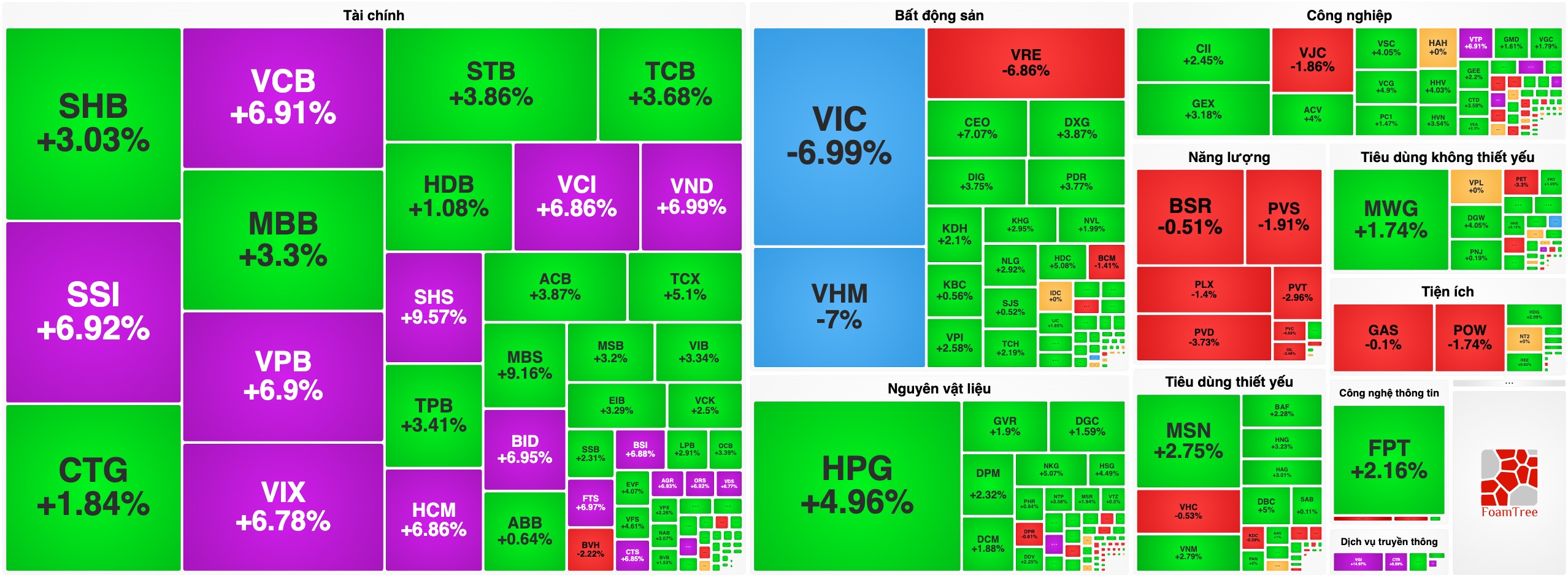 Ngân hàng: VCB tăng kịch trần (+6,91%) – hiện tượng hiếm thấy ở “anh cả” ngành bank. Cùng với đó là BID (+6,95%), VPB (+6,9%) cũng tím lịm. MBB, SHB, CTG đồng loạt tăng mạnh.