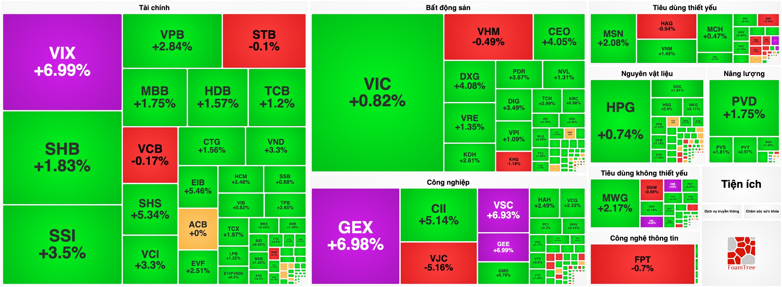 Thị trường hôm nay chứng kiến sự bùng nổ đồng loạt của các nhóm ngành dẫn dắt, với nhiều cổ phiếu tăng kịch trần.