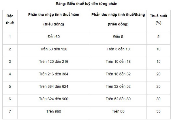 Bạn có thể áp dụng dựa theo bảng biểu thuế lũy tiến từng phần trong quy định tại Điều 22, Luật Thuế TNCN năm 2007 như sau: