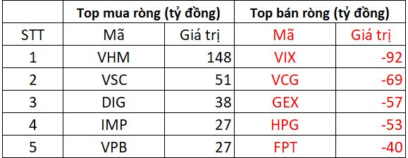 Ngược chiều, VHM được mua ròng mạnh nhất toàn thị trường với giá trị 148 tỷ đồng, VSC, DIG, VPB và IMP cũng được mua ròng với giá trị dao động từ 27 tỷ tới 51 tỷ đồng mỗi cổ phiếu.