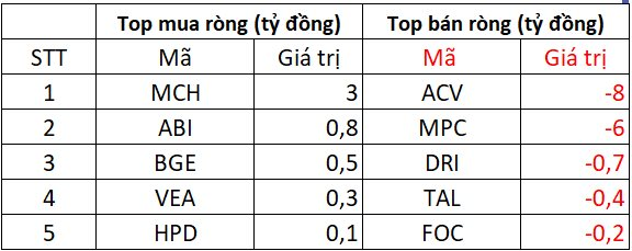 Chiều mua, cổ phiếu MCH được mua ròng với giá trị 3 tỷ đồng; theo sau, ABI, BGE, VEA và HPD cũng được mua ròng khoảng một vài trăm triệu đồng mỗi mã.