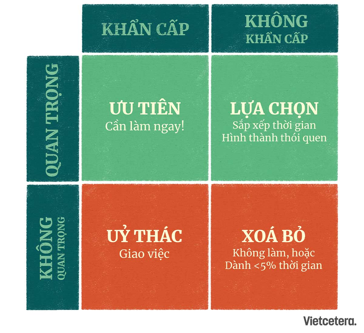 | III | Không quan trọng & Khẩn cấp | Họp gấp không cần thiết, tin nhắn “phá ngang” | Ủy quyền (DELEGATE) |