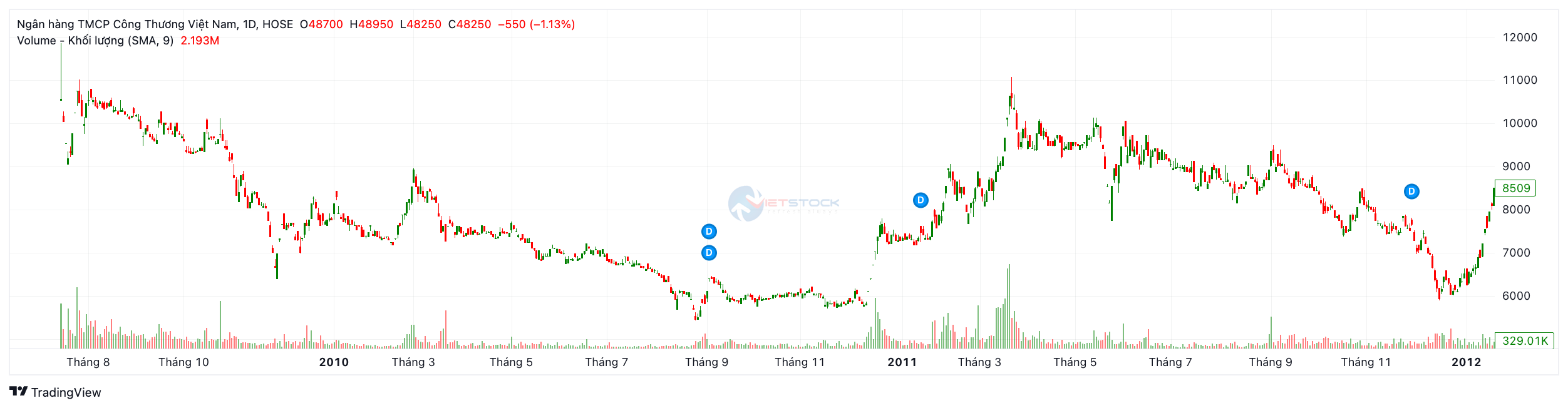 Diễn biến: Giá cổ phiếu liên tục dò đáy với 3 năm tăng trưởng âm liên tiếp: năm 2009 (-26.2%), năm 2010 (-6.3%) và năm 2011 (-10.0%). Đỉnh điểm, cổ phiếu chạm đáy lịch sử tại mức 5,350₫ vào tháng 08/2010.