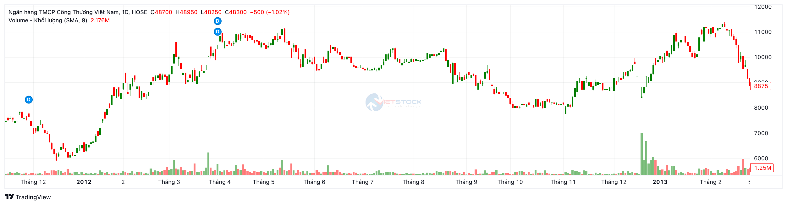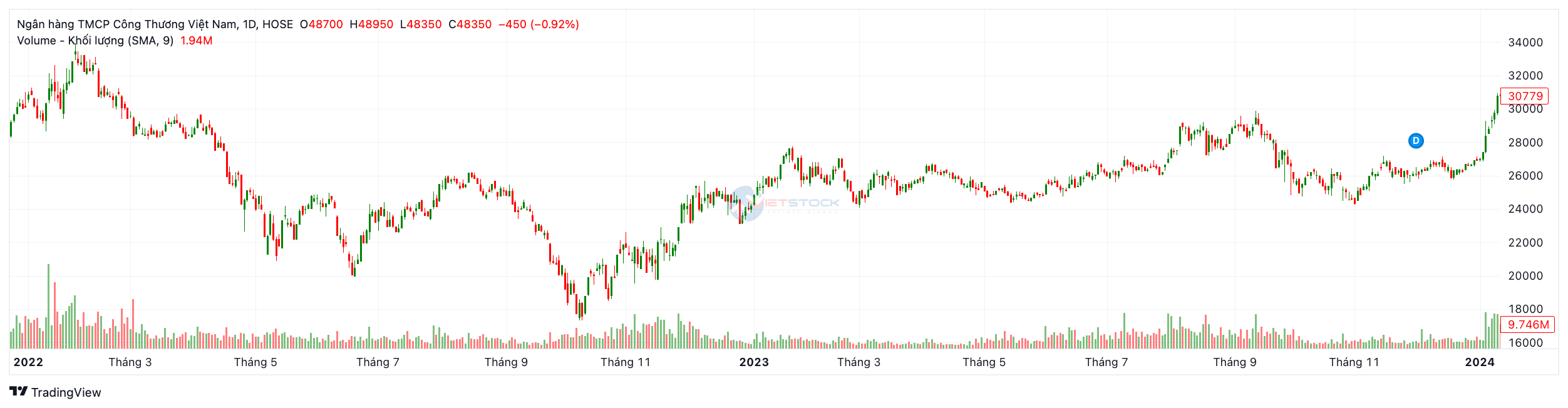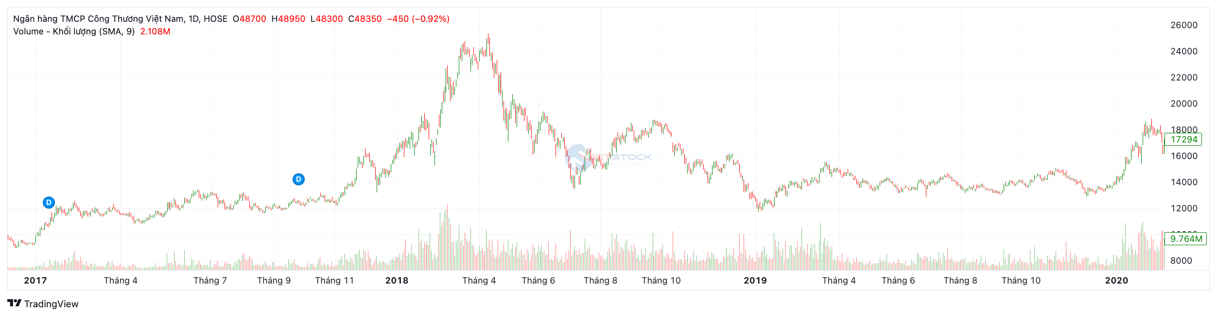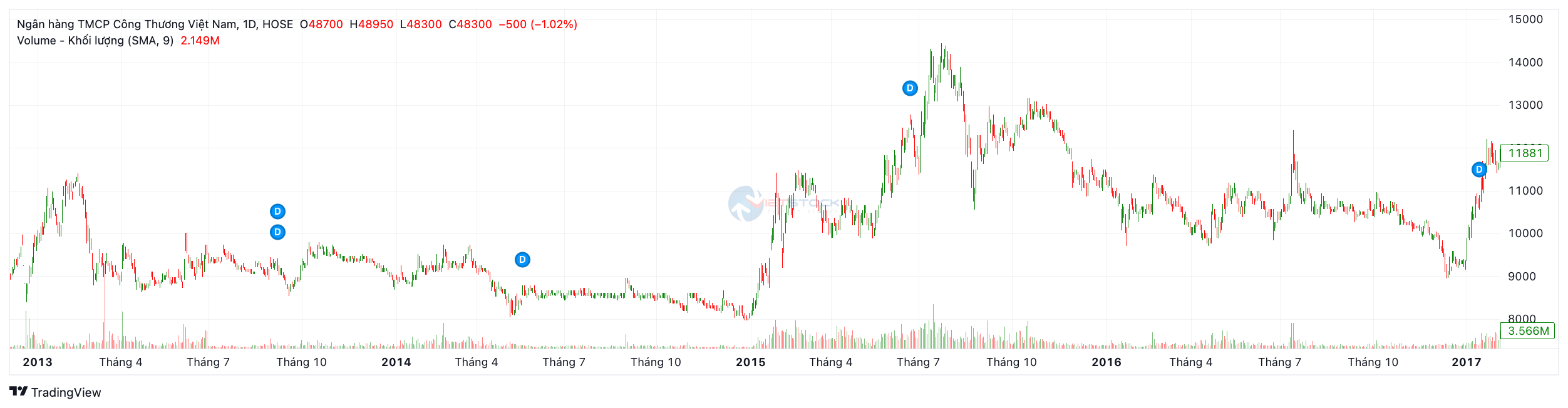 Năm 2017 (Kỷ lục lịch sử): Đây là năm thăng hoa nhất trong lịch sử niêm yết của CTG với mức tăng trưởng +73.94%. Sự bùng nổ của VN-Index (vượt 1.000 điểm) cộng hưởng với việc quá trình xử lý nợ xấu của CTG có những chuyển biến tích cực (theo Nghị quyết 42/2017/QH14) đã kích hoạt dòng tiền lớn đổ vào cổ phiếu này.