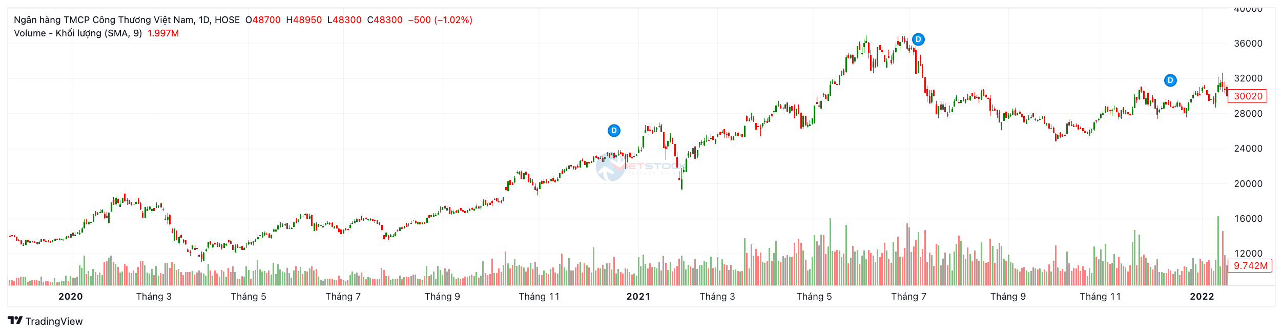 Diễn biến: Cổ phiếu CTG bước vào chu kỳ tăng trưởng thần tốc 2 năm liên tiếp: năm 2020 (+67.8%) và năm 2021 (+29.7%), đưa giá lên mặt bằng mới quanh vùng 30,000₫ – 36,000₫.