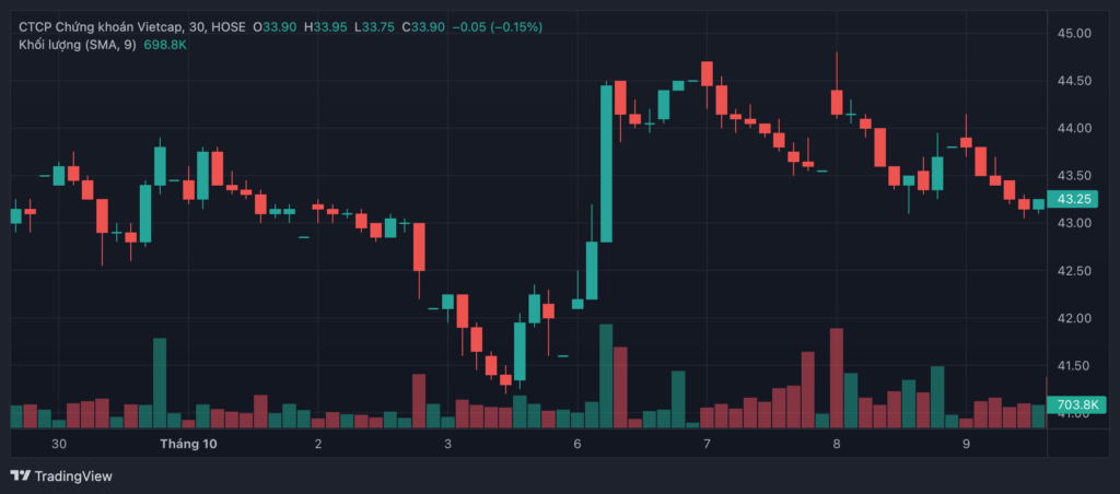 Phiên ngày 06/10 (Nến tín hiệu 2 – Nến bùng nổ): Ngay sau nhịp tích lũy, lực cầu tham gia mạnh mẽ đã đẩy giá tăng vọt ngược trở lại một cách quyết liệt. Kết thúc cây nến 30 phút này, VCI đóng cửa tại mức giá tiệm cận 44.500 VNĐ. Thân nến tăng này có biên độ cực lớn (Marubozu), bao phủ hoàn toàn thân các nến giảm và nến tích lũy của các phiên trước đó. Khối lượng giao dịch bùng nổ (cột volume xanh cao nhất trong giai đoạn này), xác nhận dòng tiền lớn (Smart Money) đã dứt khoát nhập cuộc.