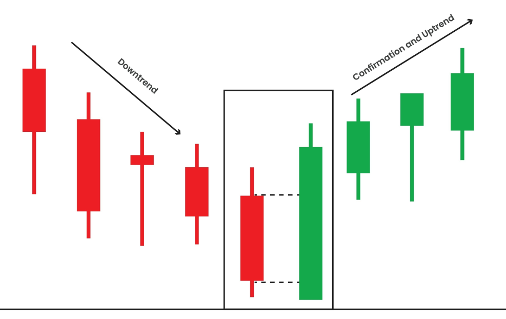 Để xác định chính xác một mẫu hình Bullish Engulfing, nhà đầu tư cần quan sát sự tương quan giữa hai cây nến liền kề: