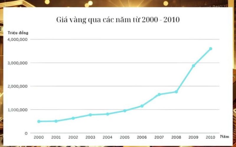 ==> Giá vàng trong nước giai đoạn 2009 – 2010 cũng nhảy vọt tư 16.48 triệu đồng/ lượng (cuối 2007) lên mức 33 triệu – 35 triệu/ lượng (cuối 2010) và lần đầu tiên trong lịch sử giá vàng SJC lên đến 49 triệu/lượng (tháng 8/2011)