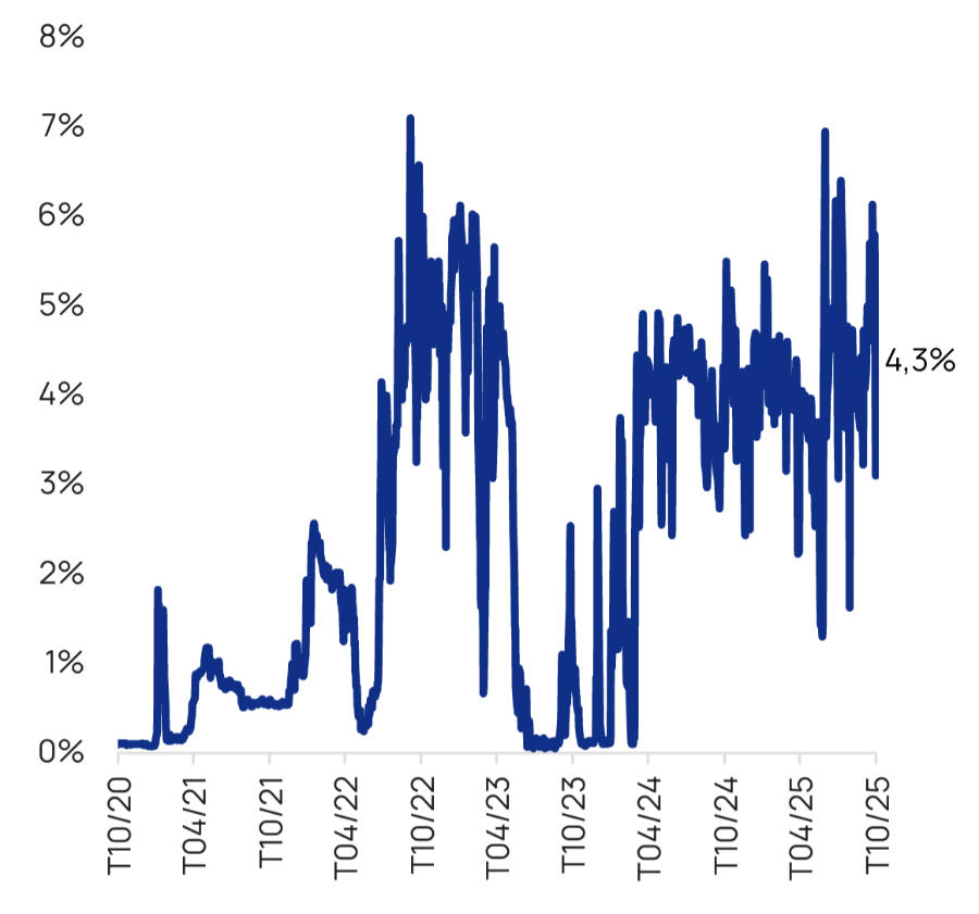 Tháng 10/2025 là ví dụ điển hình cho mục tiêu này. Hệ thống ngân hàng đối mặt với áp lực kép: khối lượng repo đáo hạn lớn (khoảng 250 nghìn tỷ đồng) và nhu cầu tín dụng tăng cao cuối năm. Điều này khiến lãi suất liên ngân hàng qua đêm có lúc tăng nóng lên mức trung bình 5,7%.