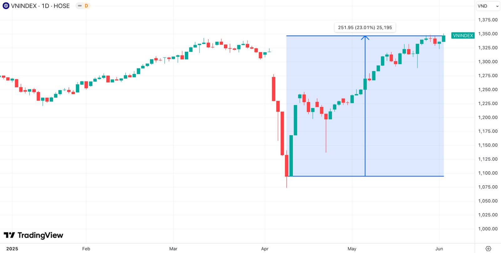 Thị trường chứng khoán Việt Nam vừa có thêm một phiên giao dịch đầy khởi sắc, VN-Index tăng gần 11 điểm (+0,82%) lên gần 1.350 điểm, cao nhất trong hơn 3 năm. Tính từ đáy thuế quan (ghi nhận vào ngày 9/4), chỉ số đã tăng hơn 250 điểm, tương đương khoảng 23%.
